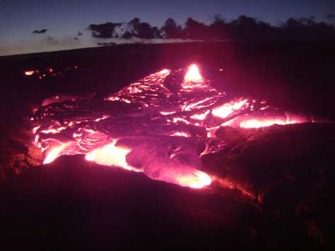 夕暮れの黒い溶岩の大地に赤い溶岩の流れ、圧巻です。