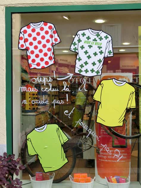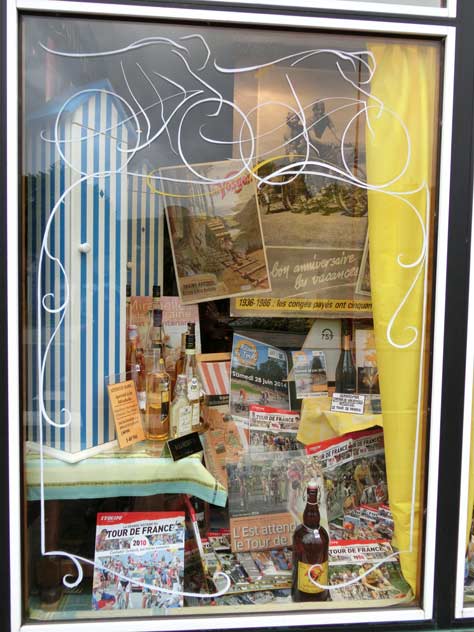 ショウウィンドウにはツール・ド・フランスをモチーフにした飾りつけをしているお店をたくさん見かけます。