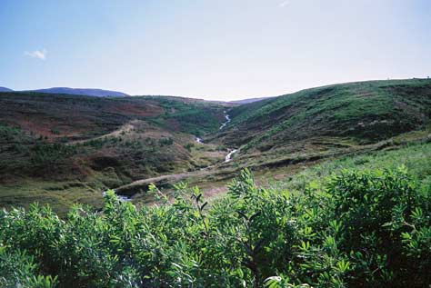 このような低木や、ベリーがなっている草などが一面に生えている丘が広がっています。